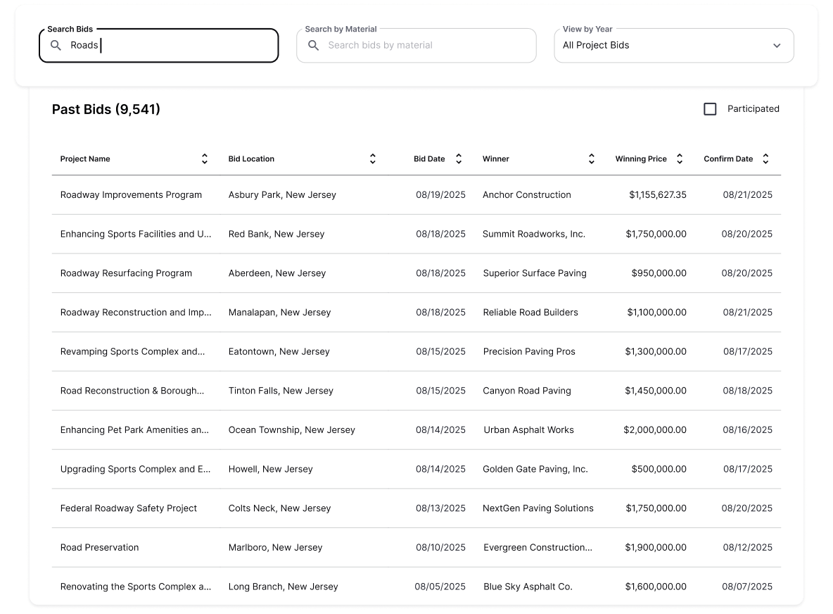 Explore the most comprehensive archive of bid tabs available. Dig into past projects, analyze line items, and supplement our analytics with your own research.