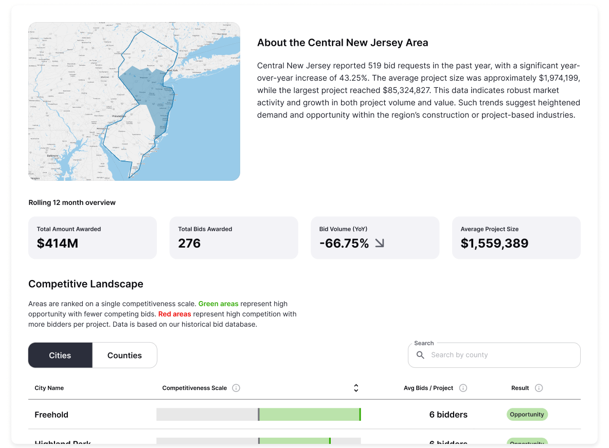 More than just market trends—we map the entire competitive landscape. Discover where the market is hot, where gaps exist, and how your competitors are moving. Use that insight to uncover opportunities and bid with confidence.
