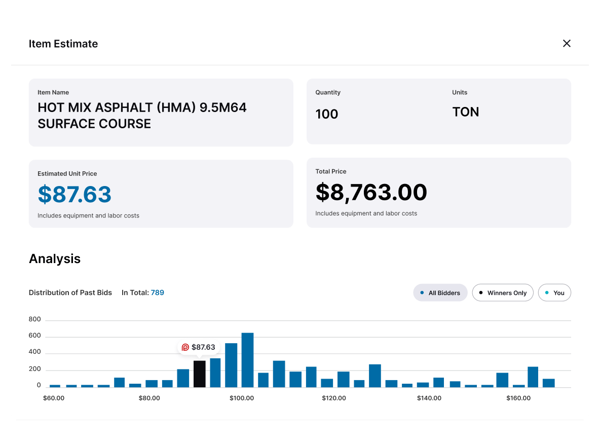 Create smarter, data-informed estimates at the item level. Compare your pricing to past bids and AI-powered projections—line by line.